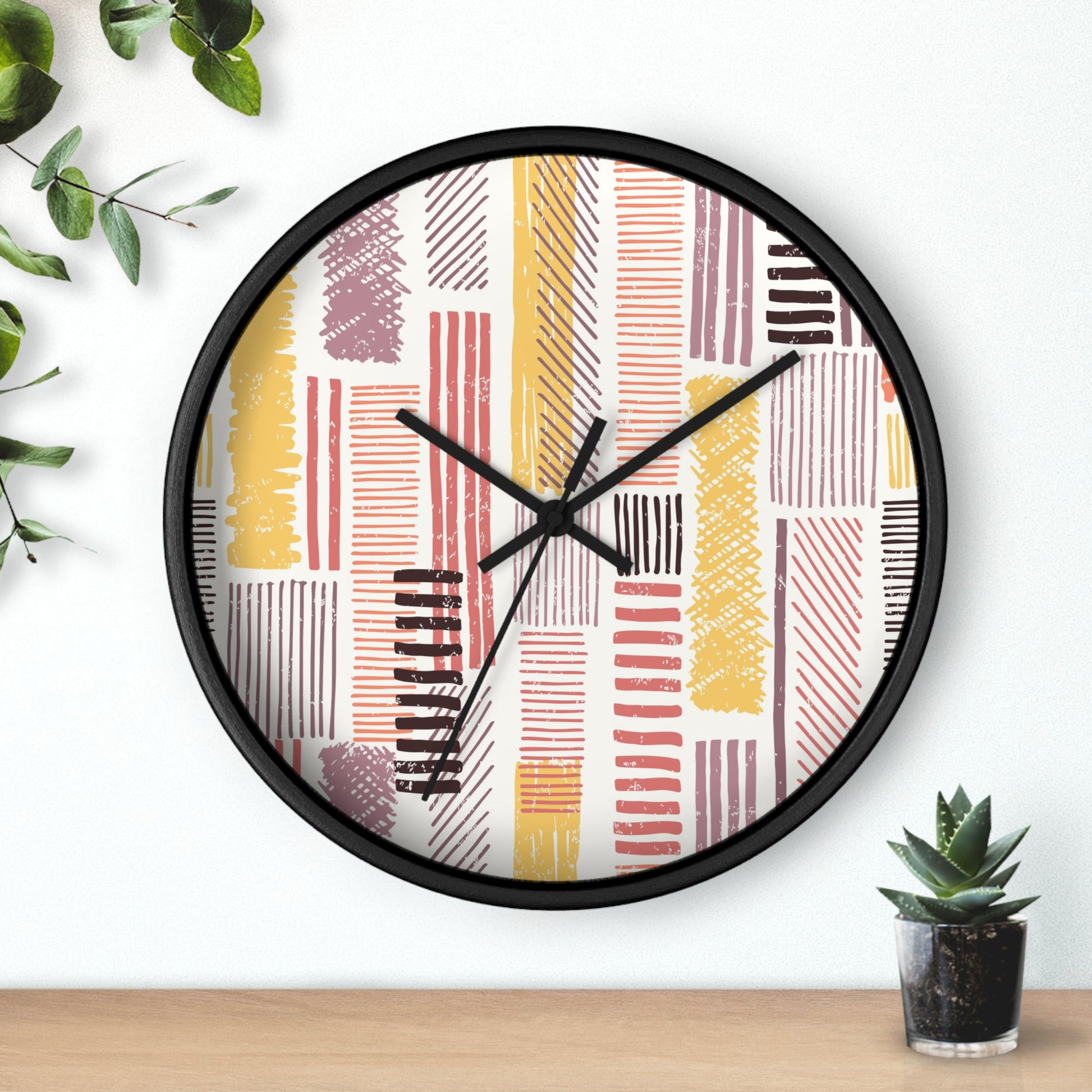 This 10" wall clock brings a gentle pop of color and a playful, retro vibe to any room. A pink field patterned with small, white ring motifs creates a warm, cheerful backdrop behind slim, silent hands. Choose a natural wood, black, or white frame and matching hands to coordinate with your decor. Lightweight and ready to hang with a pre-installed hook, it keeps time quietly with a smooth, silent mechanism—great for bedrooms, nurseries, or creative corners where tranquility matters. The plexiglass face keeps the print bright and protected, while the wood frame adds a subtle, handcrafted feel. It runs on a single AA battery (not included) and is crafted for indoor living where style meets soft, everyday function.
